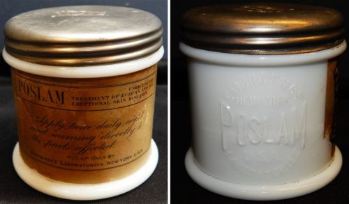 Title (ebay affiliate link): Antique Rare Medicine 5 oz Milk Glass Jar Emergency Laboratories Poslam NY USA