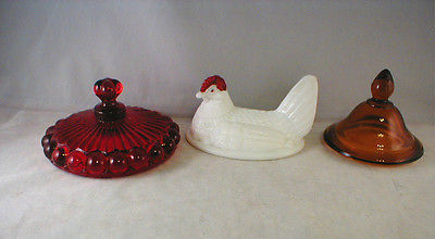 3 GLASS LIDS, RED ROUND CANDY JAR, MILK GLASS HEN ON NEST, AMBER WITH FINIAL