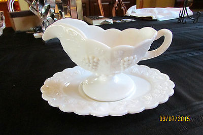 Beautiful Vintage Westmoreland PANELED GRAPE Milk Glass Gravy boat w/ Underplate