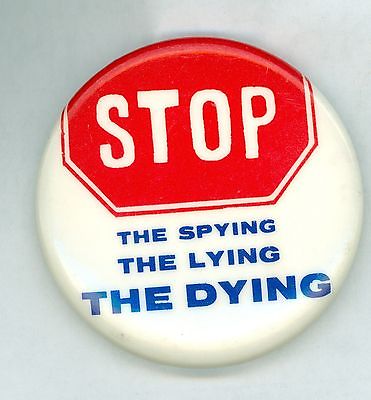 Title (ebay affiliate link): Vintage 1970s anti-Vietnam War Stop Spying Lying Dying Nixon Pinback Button