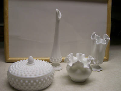 4 Pieces Vintage Fenton Milk Glass Cabbage Rose Hobnail