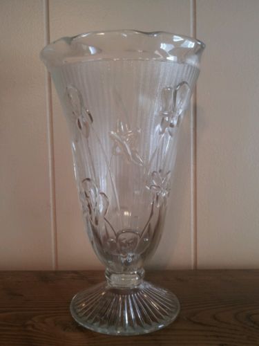 Title (ebay affiliate link): Beautiful Jeannette Iris and Herringbone 9" Clear Glass Vase Mother's Day