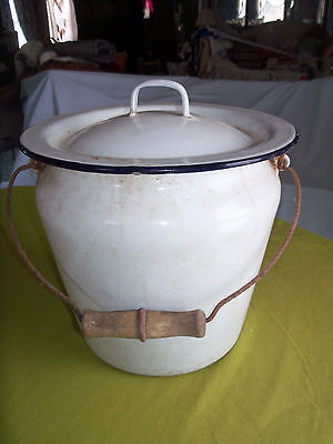 Vtg Enamel Chamber Pot lid white bucket pail planter primitive white WOOD handle