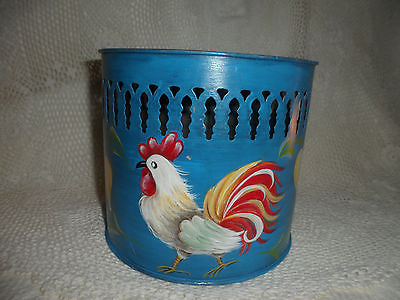 VINTAGE METAL TOLE PAINTED ROOSTER BLUE BASKET WITH FLOWERS
