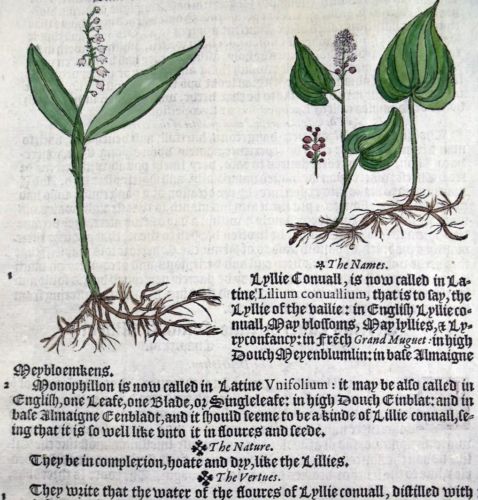 Title (ebay affiliate link): 1578 Handcol 2 WOODCUTS - LILIES Initial - Herbal Borcht LEAF ENGLISH EDN