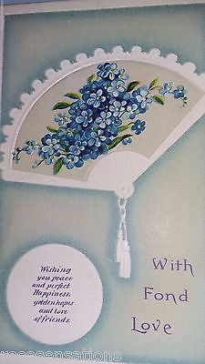 VINTAGE old GREETING postcard With Fond Love - NICE FAN Forget me nots flowers