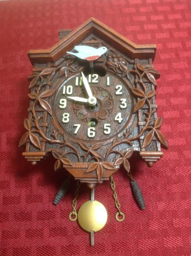 Title (ebay affiliate link): ANTIQUE LUX MINIATURE CUCKOO CLOCK ORIGINAL PENDULETTE BLACK FOREST BLUE BIRD