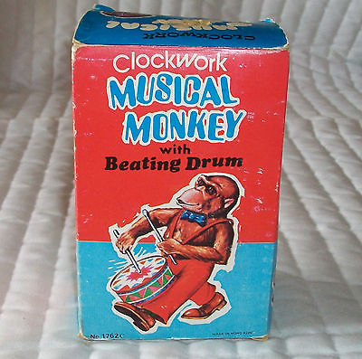 Title (ebay affiliate link): VINTAGE CLOCKWORK # 1762C MUSICAL MONKEY W/ BEATING DRUM WIND UP TOY