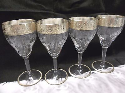 SET 4 VINTAGE ELEGANT Sterling Silver Overlay Rim ETCHED Wine Cordials Glasses