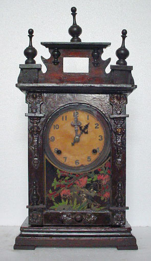 ANTIQUE 3 FINIAL FLORAL PANEL BRASS DECO MANTLE CLOCK