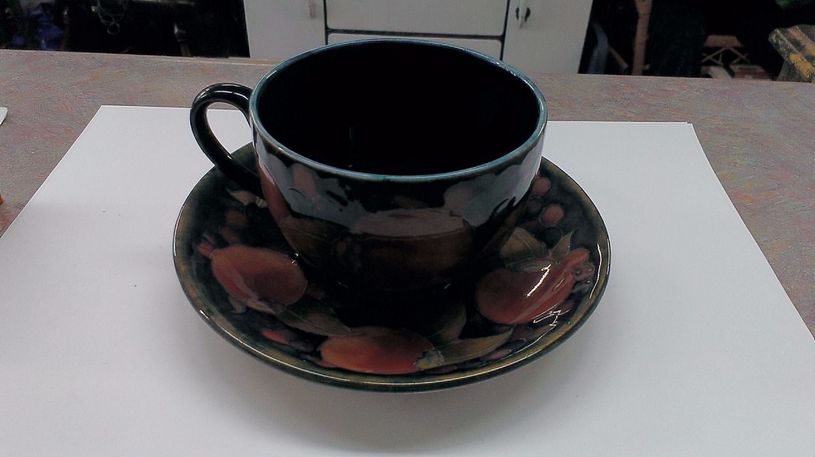 Title (ebay affiliate link): AMAZING ANTIQUE MOORCROFT COBALT BLUE CUP AND SAUCER FRUIT RARE GOOD SHAPE