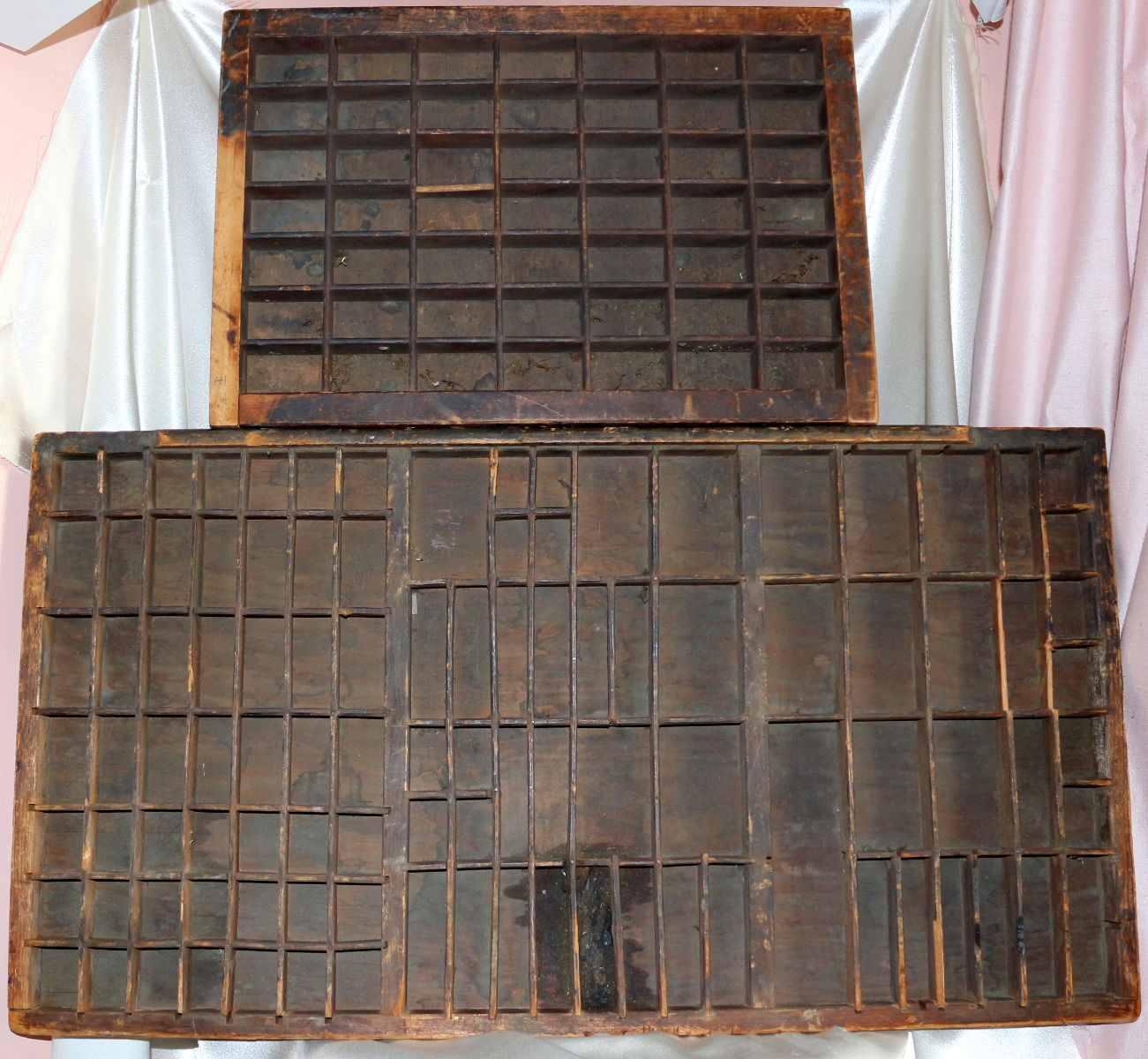 2 ANTIQUE VINTAGE TYPESET PRINTING DRAWER LARGE MED. SHADOWBOX MINIATURES TRAY