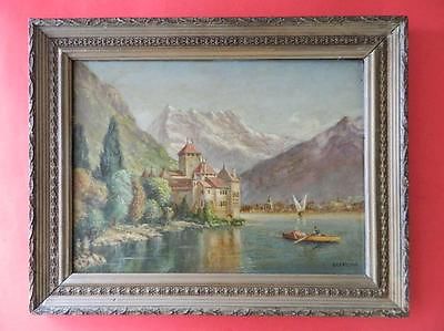 Original Hans Painted Oil Painting Swiss German Alps? Landscape Castle Lake 1954