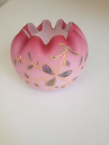 Victorian Satin Art Glass Pink Painted Enameled Rose Bowl