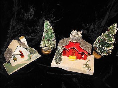 Vintage Japan cardboard Christmas houses, Two cute miniature bottle brush trees