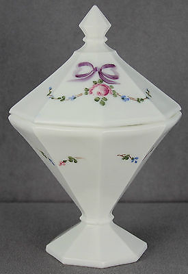 VINTAGE SIGNED WESTMORELAND HEXAGONAL MILK GLASS COVERED BOX ROSES BOWS FOOTED