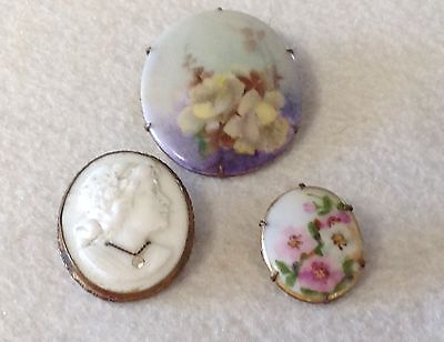 3 Antique Brooches Porcelain Floral Design & Milk Glass Cameo Brass Frames