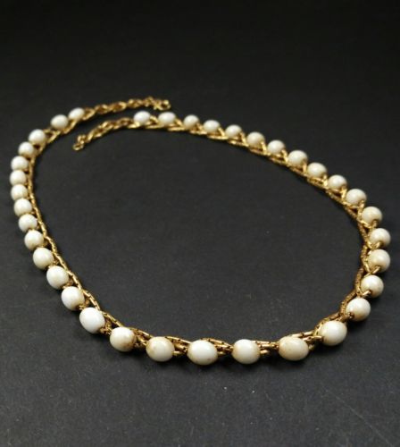 Title (ebay affiliate link): Signed MONET Necklace Milk Glass White Bead Gold Tone Chain Ripe Twist Weave P74