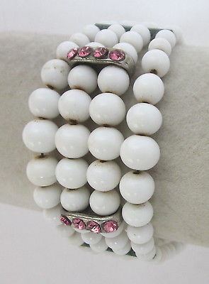 Vintage Milk Glass Bead Pink Rhinestone Coil Bracelet