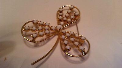 Lovely vintage LARGE FACETED WHITE MILK GLASS RHIINESTONE GOLDEN CLOVER BROOCH