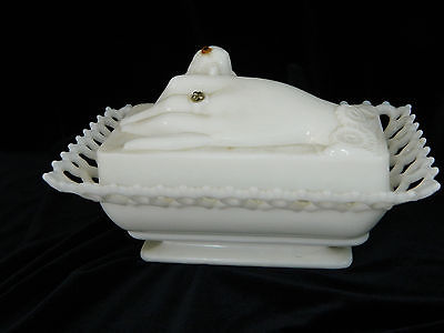 1889 Westmoreland Bird in the Hand Milk Glass Dish w/ Rhinestone Lid