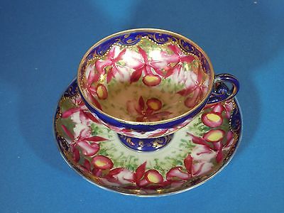 Nippon Cup & Saucer Orchid Design Cobalt Blue Gold Moriage Beads