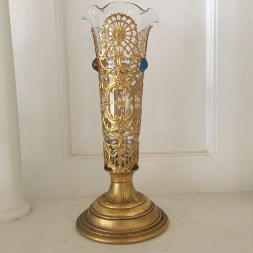 Title (ebay affiliate link): Antique Victorian Brass Ornate Filigree Jeweled Flower Vase Religious
