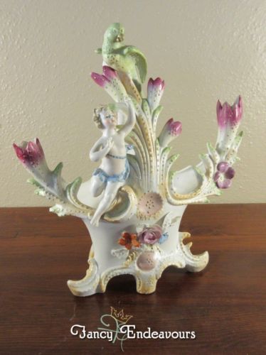 Title (ebay affiliate link): Antique German Bisque Porcelain Basket Tulips Putti and a Parrot Bird