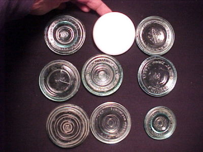 8 Vintage Fruit Jar Lids Mason and 1 Milk Galss Lid