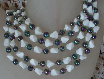 Vintage 5 Strand Milk Glass & Iridescent Necklace/Japan