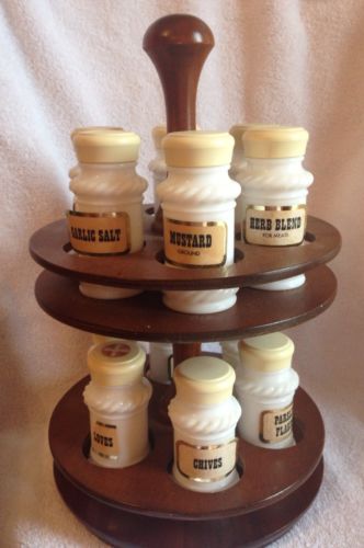 Vintage Milk Glass Spice Rack With 12 Jars and Wood Rack