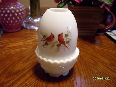 Pretty vintage Fenton white milk glass with cardinals fairy lamp/candle holder