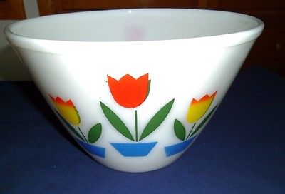 Title (ebay affiliate link): Vintage FIRE KING Milk Glass 8.5" MIXING NESTING BOWL RED YELLOW TULIPS