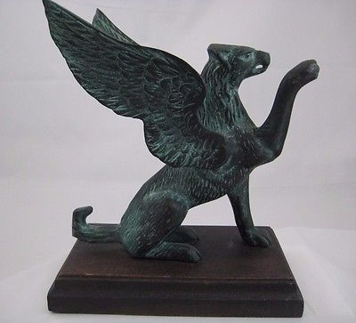 Mythological Eagle-Winged Lion on Wooden Base, Bronze/Brass Patina