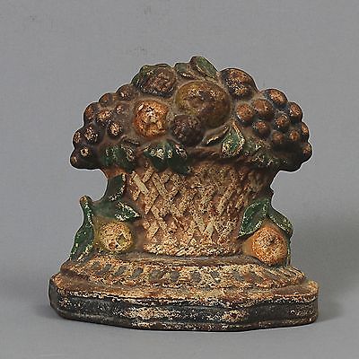 Antique Cast Iron Doorstop, Fruit in Woven Basket, Original Paint, Hubley?