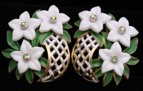 Title (ebay affiliate link): Vintage Crown Trifari Enamel Crystal Rhinestone Milk Glass Flower Spray Earrings