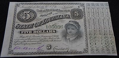 1870's 5 dollar Baby Bond State of Louisiana Choice UNC with 5 Coupons Excellent