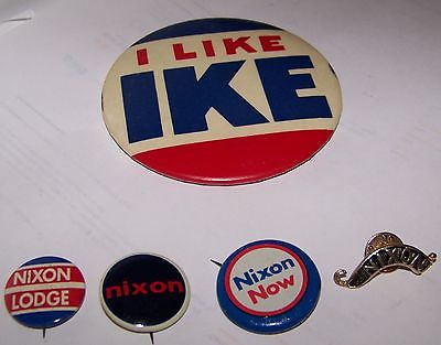 4 - 1956-1960 Nixon-Lodge-Ike Presidential Buttons + Nixon Stick Clamp On Pin
