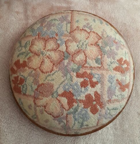 Title (ebay affiliate link): Vintage footstool. Circular. Tapestry topped. Wooden base.