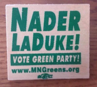 Title (ebay affiliate link): Ralph Nader Winona LaDuke for President 2000 Button Pin Minnesota Green Party