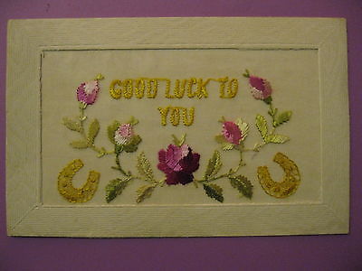 WW1 WWI Silk Postcard ~ GOOD LUCK TO YOU~ Horseshoe & Roses
