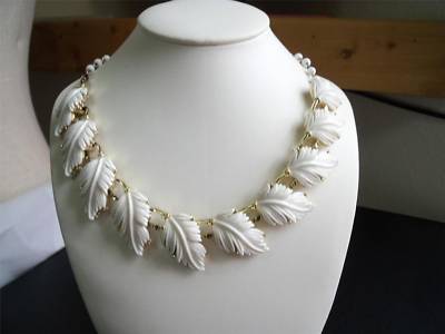 Vintage White Thermoset Leaves Necklace Milk Glass