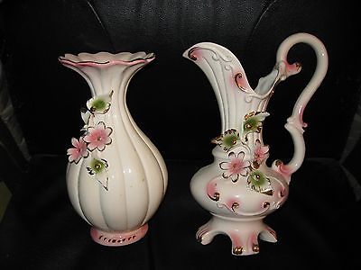 OLD CAPODIMONTE PITCHER & VASE SET (PINK AND GREEN)