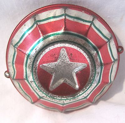 Antique Tin Litho Christmas Ornament Disc with Star Red Green Silver Made in USA