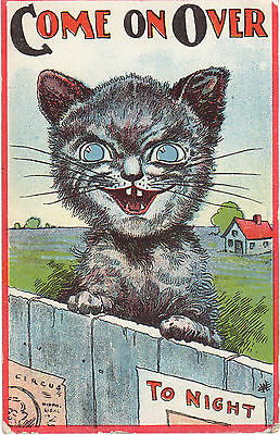 Vintage 1915 crazed cat postcard looking over fence asking "come on over"