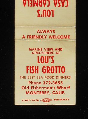 Title (ebay affiliate link): 1960s Matchbook Lou's Fish Grotto Old Fishermans Wharf Carmel Valley Monterey CA