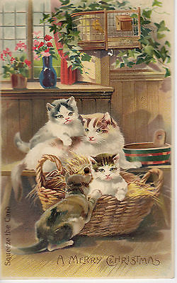 Vintage Mint 1910 postcard with working squeeker, cats in a basket Christmas