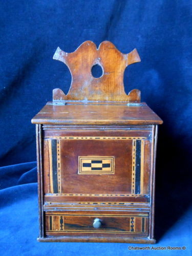 Title (ebay affiliate link): Antique English Georgian Inlaid Wall Hanging Lidded Tea Spice Box with Drawer