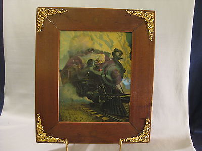ANTIQUE WOOD PICTURE FRAME,METAL/BRASS CORNER DECORATION,railroad engine,train