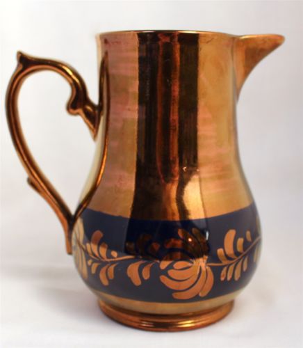 Antique Copper Lusterware Pitcher With Floral & Blue Accents